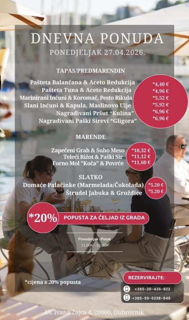 Imate ponudu dnevnih marendi, i želite ih promovirati na dubrovniknetu?! Javite se s povjerenjem na marketing@dubrovniknet.hr ili na 091 344 6000
