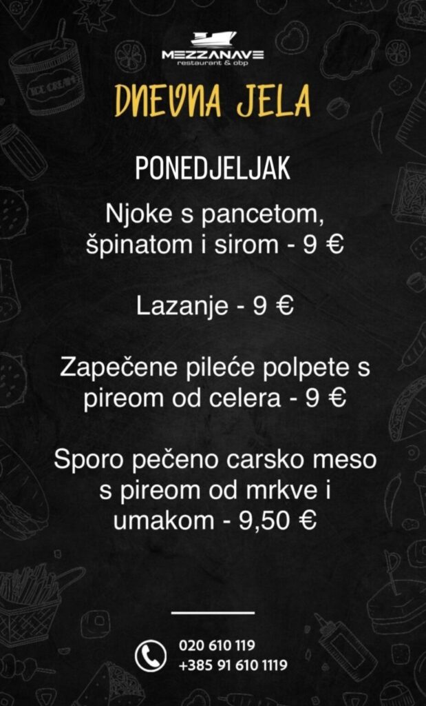 Restoran Mezzanave, Dr. Ante Starčevića 24, telefoni: 020 610 119, 091 610 1119, moguća dostava