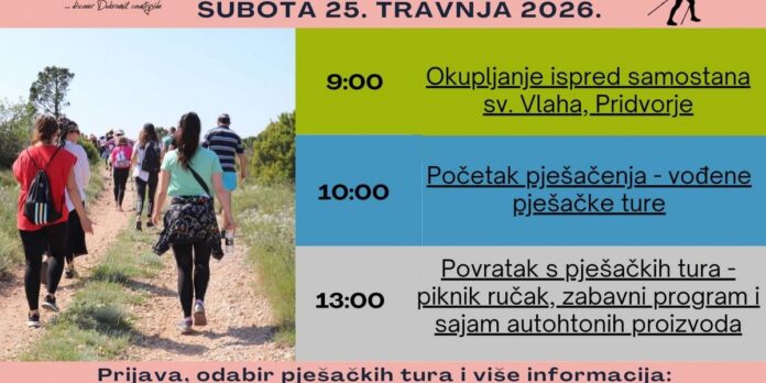 U subotu, 25. travnja 2026. godine, u Konavlima se održava “Festival nordijskog hodanja i pješačenja – Konavle 2026.“, manifestacija koja spaja rekreaciju, prirodnu baštinu i autentičnu konavosku gastronomiju. Program započinje u 9:00 sati okupljanjem ispred samostana sv. Vlaha u Pridvorju, dok je početak vođenih tura predviđen u 10:00 sati. Sudionici će moći birati između tri različite rute prilagođene razinama kondicije, uz stručno vodstvo i sadržajan program na terenu.