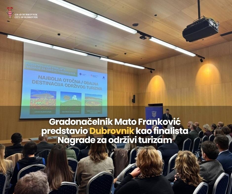 Grad Dubrovnik jedan je od tri finalista hrvatske Nagrade za održivi turizam u kategoriji Najbolja otočna/obalna destinacija održivog turizma. Svečano predstavljanje finalista održano je danas u Zagrebu, gdje je Dubrovnik pred stručnim žirijem predstavio gradonačelnik Mato Franković, iznijevši mjere i aktivnosti koje Grad provodi u cilju unapređenja održivog upravljanja turizmom. Nakon čega su uslijedila pitanja stručnog žirija.