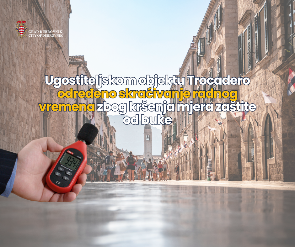 Na temelju obavijesti Policijske postaje Dubrovnik, kojom su potvrđena tri prekršaja zbog prekoračenja dozvoljene razine buke u ugostiteljskom objektu „Trocadero“ (Zamanjina 8), doneseno je rješenje o skraćivanju radnog vremena predmetnog objekta za dva sata, u trajanju od 30 dana, počevši od 6. listopada 2025. godine.