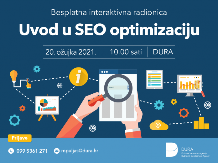 Posljednjih nekoliko godina mnogo se priča o SEO optimizaciji, a malo ljudi zna što je zapravo to. Odgovor na pitanje što je SEO optimizacija te kako pomoću nje pospješiti vlastitu poslovnu priliku ćete dobiti upravo na radionici “Uvod u SEO optimizaciju” koju za Vas organizira DURA u okviru Startup akademije. Radionica će se održati u subotu, 20. ožujka 2021. godine u prostorijama DURA-e, na adresi Branitelja Dubrovnika 15, 20 000 Dubrovnik s početkom u 10:00 sati.