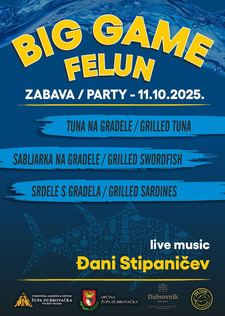 Športsko ribarski klub Felun nakon odličnih ribarskih noći, žele okruniti sezonu i organiziraju Big Game Felun, turnir u ribolovu na velike ribe: tune, sabljarke, luca, lampuge. Big Game će se održati od srijede, 8. listopada do subote 11. listopada, u ribolovnoj zoni od Molunta do Mljeta.