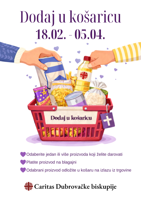 Caritas Dubrovačke biskupije i ove korizme pokreće akciju ”Dodaj u košaricu” u suradnji s trgovačkim lancima i trgovinama na području grada Dubrovnika, Župe dubrovačke i Konavala – Tommy, Konzum, Studenac, “DB Kantun” i “Trgovina Mokošica”.