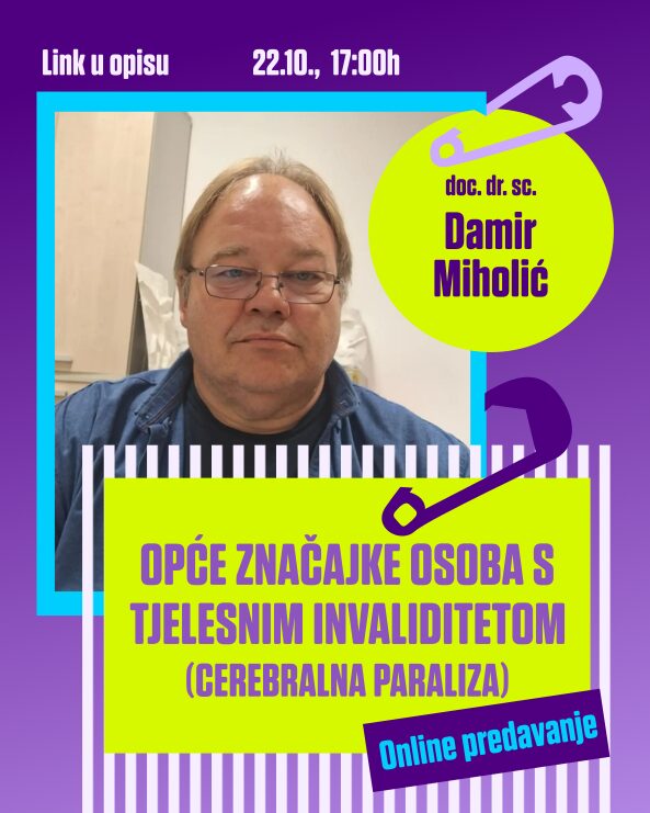 Dan poslije, u srijedu, 22. listopada u 17 sati, održat će se online predavanje “Opće značajke osoba s tjelesnim invaliditetom (cerebralna paraliza)” koje će voditi doc. dr. sc. Damir Miholić, s Edukacijsko-rehabilitacijskog fakulteta Sveučilišta u Zagrebu, stručnjak za motoričke poremećaje, kronične bolesti i art terapiju. Predavanje će obuhvatiti osnovne kliničke karakteristike motoričkih poremećaja, prilagodbe za potpuniju inkluziju te smjernice za svakodnevnu komunikaciju s osobama s invaliditetom. Budući da je riječ o online predavanju, poveznica na predavanje bit će dostupna OVDJE. Također, informacije će pravovremeno biti objavljene na društvenim mrežama projekta: