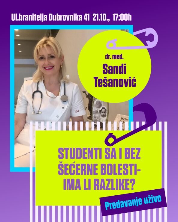 Sljedeće predavanje održat će se u utorak, 21. listopada u 17 sati, pod nazivom “Studenti sa i bez šećerne bolesti – ima li razlike?” Predavačica je dr. med. Sandi Tešanović, specijalistica interne medicine i subspecijalistica endokrinologije i dijabetologije, s dugogodišnjim iskustvom u radu s pacijentima oboljelima od šećerne bolesti, osobito mladima. Kroz predavanje će približiti što znači biti student i živjeti sa šećernom bolešću tipa 1 te koje izazove, ali i mogućnosti, takvi studenti imaju u akademskom okruženju. Predavanje će se održati na Kampusu Sveučilišta u Dubrovniku (Ul. Branitelja Dubrovnika 41).