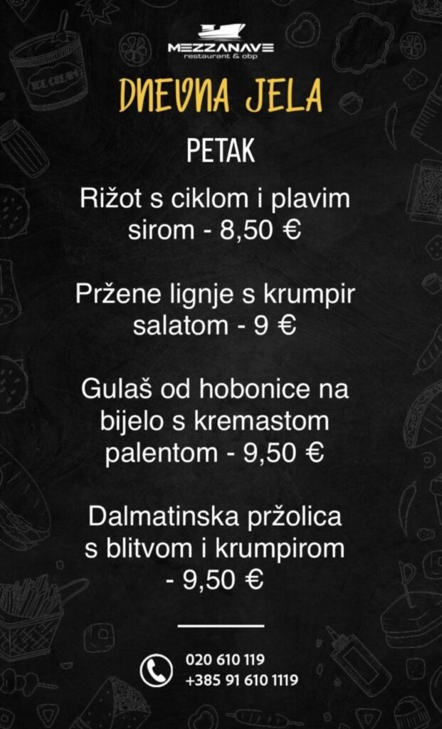 Restoran Mezzanave, Dr. Ante Starčevića 24, telefoni: 020 610 119, 091 610 1119, moguća dostava