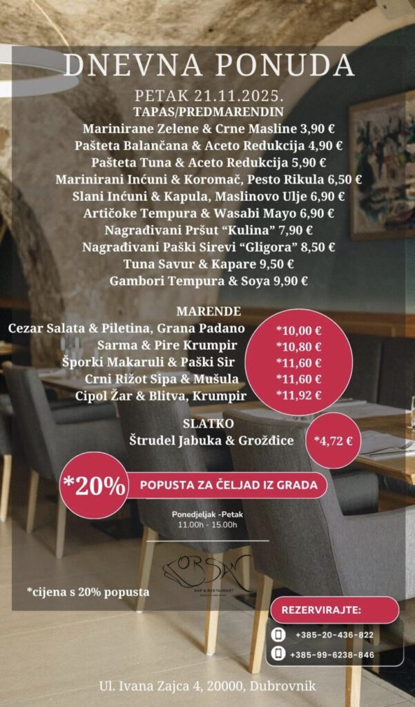 Imate ponudu dnevnih marendi, i želite ih promovirati na dubrovniknetu?! Javite se s povjerenjem na marketing@dubrovniknet.hr ili na 091 344 6000