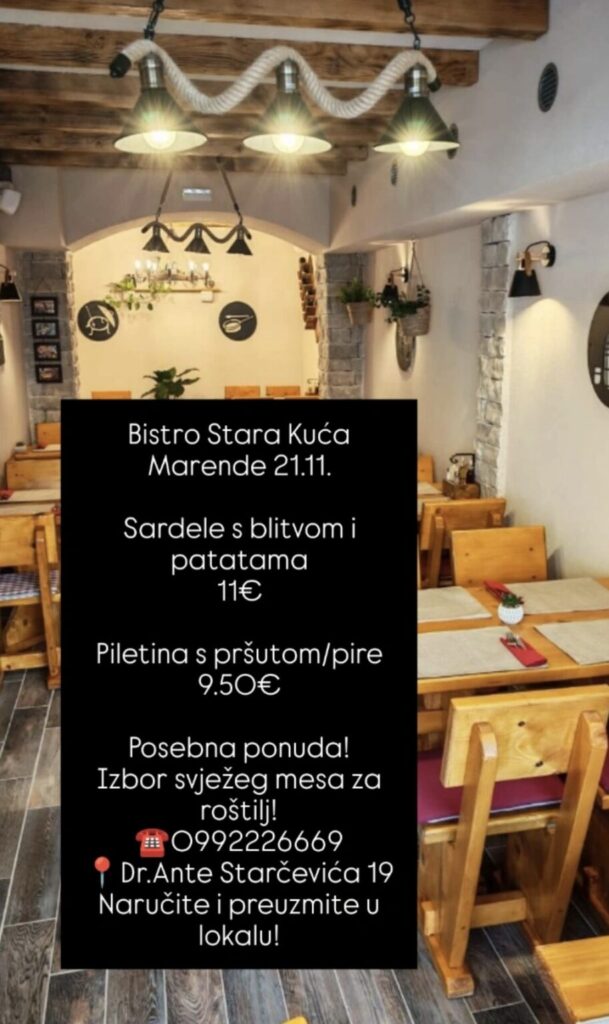 Bistro Stara Kuća, Dr.Ante Starčevića 19, kontakt 099 222 6669, ne vrše dostavu, moguće preuzimanje u restoranu
