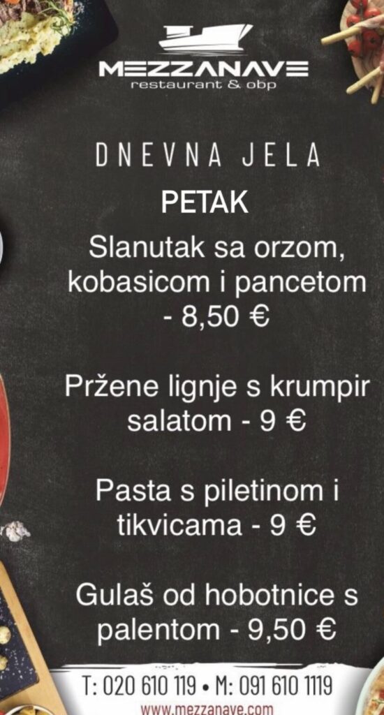 Restoran Mezzanave, Dr. Ante Starčevića 24, telefoni: 020 610 119, 091 610 1119, moguća dostava