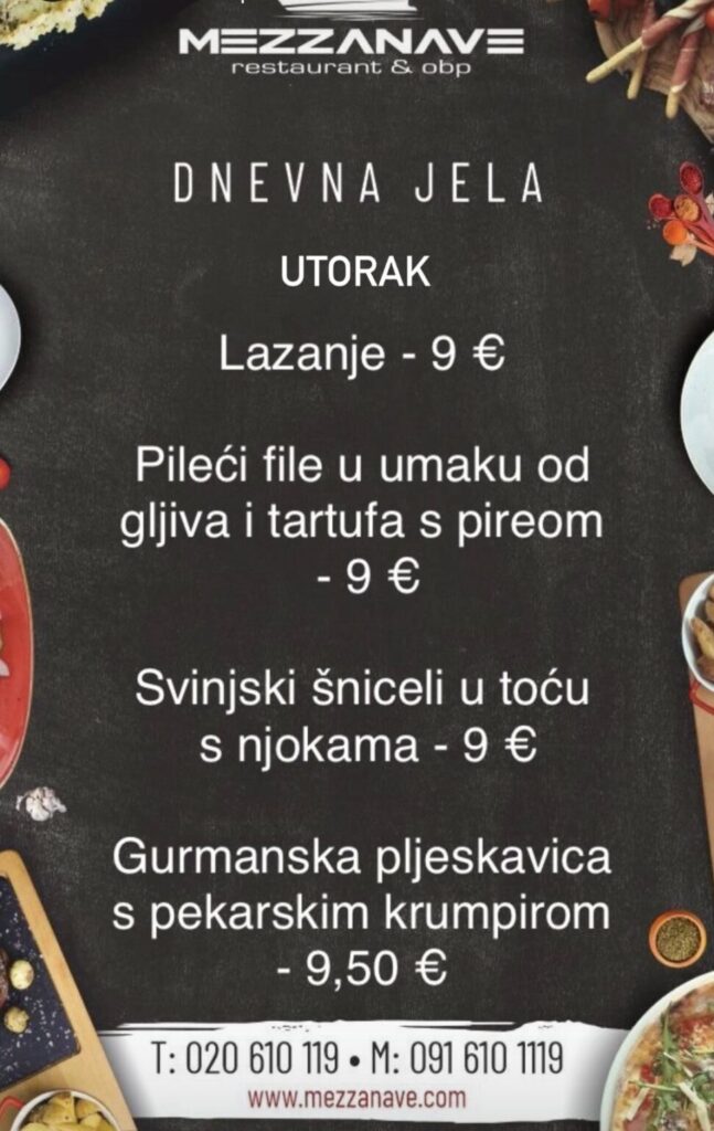 Restoran Mezzanave, Dr. Ante Starčevića 24, telefoni: 020 610 119, 091 610 1119, moguća dostava