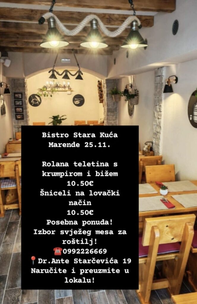 Bistro Strara Kuća, Dr.Ante Starčevića 19, kontakt 099 222 6669, ne vrše dostavu, moguće preuzimanje u restoranu
