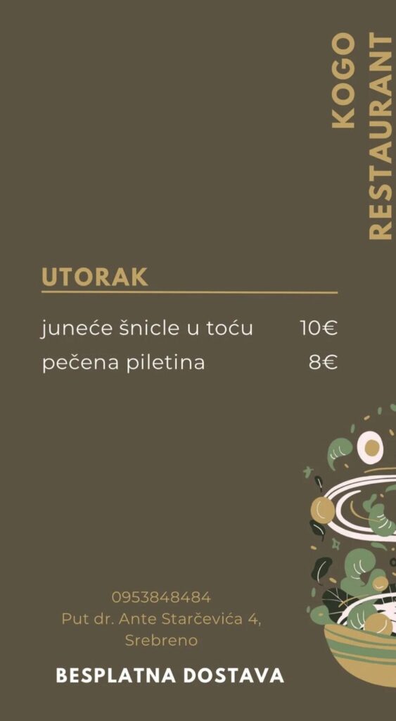 Restoran KOGO, Srebreno, Župa dubrovačka – 095 384 8484, 095 596 8873, moguća dostava