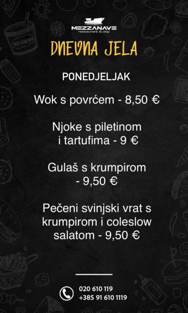 Restoran Mezzanave, Dr. Ante Starčevića 24, telefoni: 020 610 119, 091 610 1119, moguća dostava