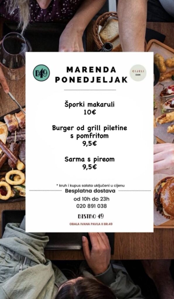 Bistro 49, Obala Ivana Pavla II, br.49, kontakt 020 891 038, moguća dostava