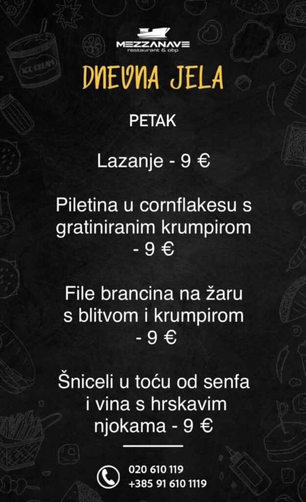 Restoran Mezzanave, Dr. Ante Starčevića 24, telefoni: 020 610 119, 091 610 1119, moguća dostava