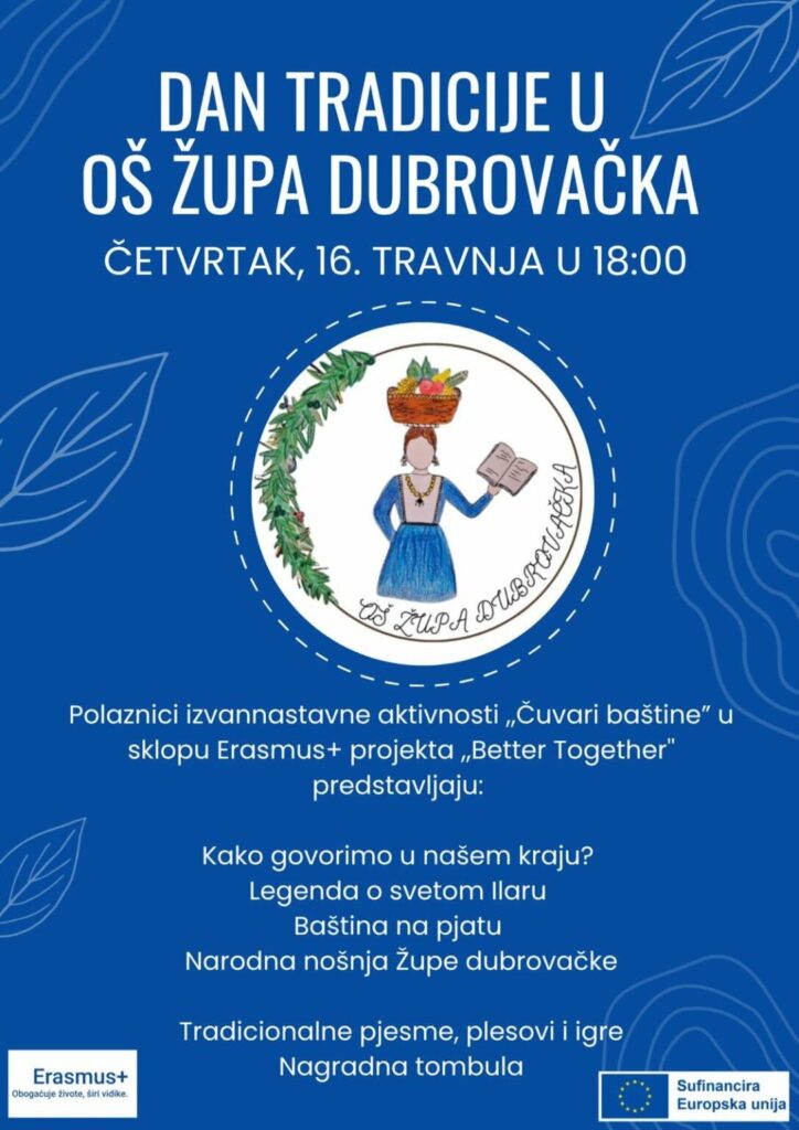 U Osnovnoj školi Župa dubrovačka u četvrtak, 16. travnja održat će se „Dan tradicije“. Program počinje u 18 sati, a pripremaju ga učenici izvannastavne aktivnosti „Čuvari baštine“ u sklopu Erasmus+ projekta „Better Together“.