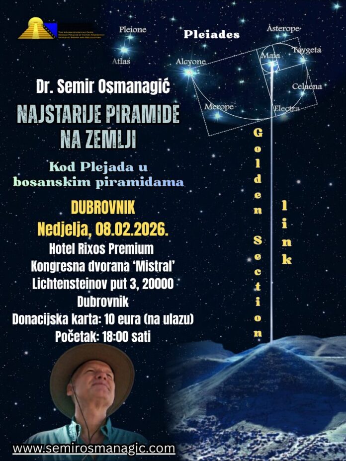 Dubrovnik će 8. veljače 2026. godine biti domaćin predavanja dr. Semira Osmanagića, međunarodno priznatog istraživača i autora, koji će u kongresnoj dvorani „Mistral“ (Lichtensteinov put 3) predstaviti temu „Najstarije piramide na Zemlji – Kod Plejada u bosanskim piramidama“. Predavanje započinje u 18:00 sati.