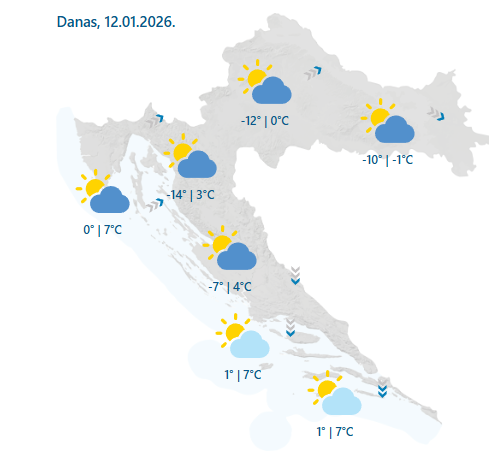 Na Jadranu slaba i umjerena bura i sjeverac, na jugu u prvom dijelu dana jak, a na sjevernom dijelu zapuhat će jugozapadnjak i jugo. Najviša dnevna temperatura od -2 do 3, na Jadranu između 5 i 10 °C”, vremenska je prognoza DHMZ-a za danas.