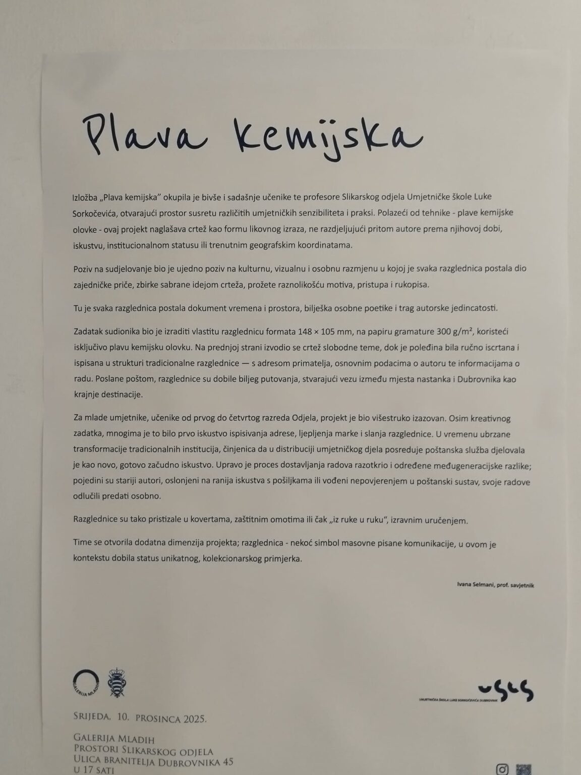 Izložba “Plava kemijska” otvorena je u srijedu u “Galeriji mladih” na Slikarskom odjelu Umjetničke škole Luke Sorkočevića. Na izložbi svoje radove su prikazali bivši i sadašnji učenici i profesori Slikarskog odjela Umjetničke škole, a to su redom: