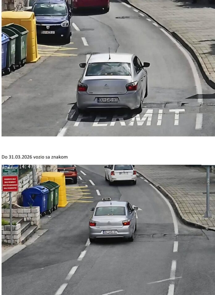Ujedno, upravo je u tim grupama takozvanim taksi vozačima, kako bi izbjegli kazne za ulazak u zonu posebnog prometnog režima, predloženo ishodovanje PPK kartica, što znači brisanje djelatnosti auto taksi prijevoza iz prometne dozvole te skidanje taksi oznaka prilikom ulaska u zonu. Dostavljam samo par fotografija vozila koja su ulazila u zonu posebnog prometnog režima s taksi znakom dan prije stupanja zone u primjenu, dakle 31. ožujka, i nakon stupanja zone u primjenu od 1. travnja 2026., gdje je vidljivo kako se taksi oznake uklanjaju i obavlja vožnja protivno Zakonu o prijevozu u cestovnom prometu.