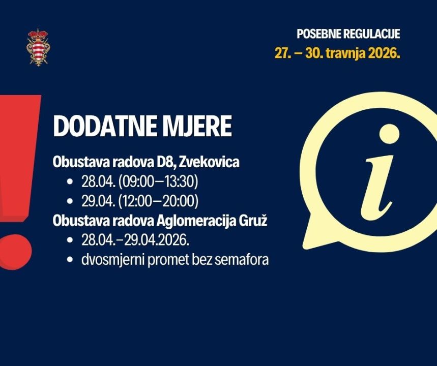 Dodatne mjere, pojasnio je gradonačelnik Franković obuhvaćaju obustava radova na D-8 na Zvekovici i to 28. 4 i 29. 4., a istog dana zaustavit će se i radovi na Aglomeraciji u Gružu, kako bi se povečala protočnost. Na cesti D-8 bit će organizirano vatrogasno dežurstvo.