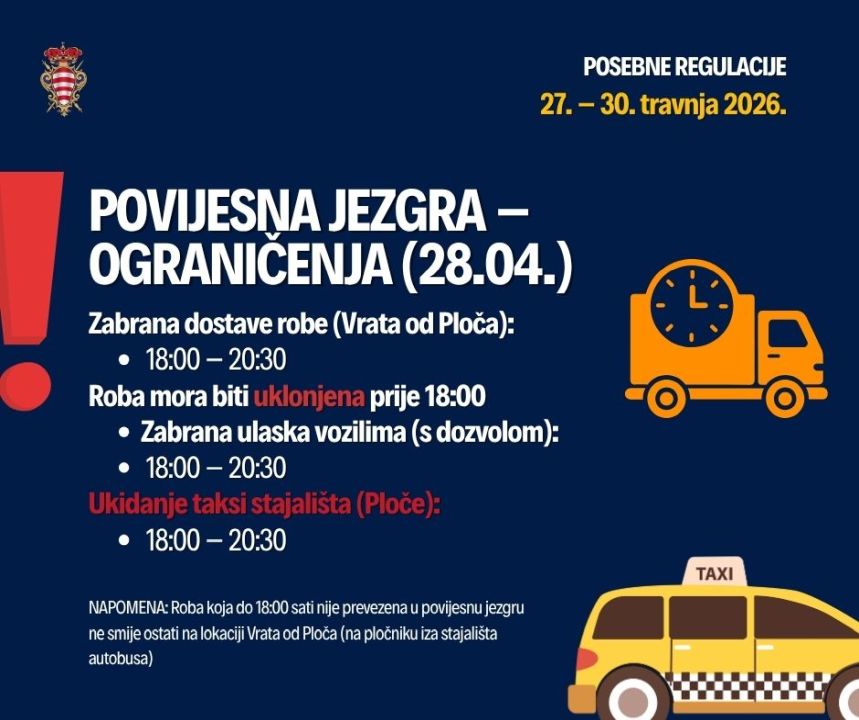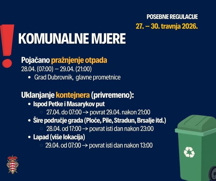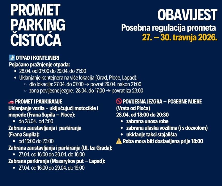“Što se tiče komunalnih mjera ide pojačano pražnjenje otpada na glavnim prometnicama i to 28.4 od 7 sati do 29. 4 do 21 sat. Kontjeneri za otpad privremeno će se ukloniti ispod Petke i na Masayrkov putu od 27.4 od 7 sati, a vrati će se 29.4 nakon 21 sat, s tim da ostaju kontejneri u poprečnim ulicama. Na širem području Grad, Pločama, Pilama, Stradunu, Brsaljama, kontejneri će se ukloniti 28. 4 do 17 sati, a vrati će se istog dana od 23 sata. U lapadu će se kontejneri a više lokaciju ukoniti 29. 4. od 7 sati, a vratit će se isti dan od 13 sati. U povijesnoj jezgri 28.4 od 18 do 20:30 sati na snazi će biti zabrana dostave robe kroz Vrata od Ploča, kao i zabrana ulaska vozilima s dozvolom od 18 do 20:30, a ukidamo taksi stajališta Ploče od 18 do 20:30. Što se tiče javnog prijevoza, linija broj 4 će biti skraćena i vozit će do Masarykova puta“, pojasnio je Franković.