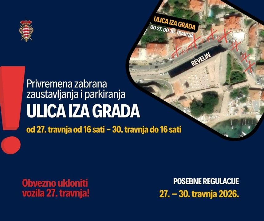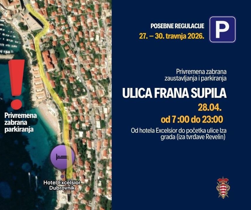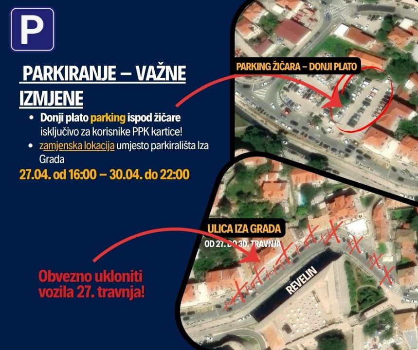 „Privremena zabrana zaustavljanja i parkiranja na području iza Revelina bit će na snazi od 27. travnja od 16 sati do 30. travnja do 22 sati kad molimo građane da izmjeste automobile. Ukidamo 20-ak parking mjesta, koja ćemo nadomjestiti na parkingu Žičara, donji plati, koji će u tom razdoblju biti besplatan za naše sugrađane koji su nositelji PPK kartice. Tu ima nešto više od 30 mjesta. U Ulici Frana Supila zabrana će biti na snazi od 28. 4. od 7 sati do 23 sata, to će biti samo toga dana. Imamo različite datume i sate, nije svugdje isto. Masarykov put, privremena zabrana zaustavljanja i parkiranja ispod Lapadskih dvora, vrijedit će od 27. 4. u 16 sati do 29. 4 u 19 sati.