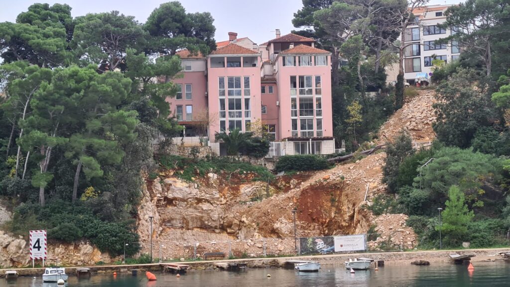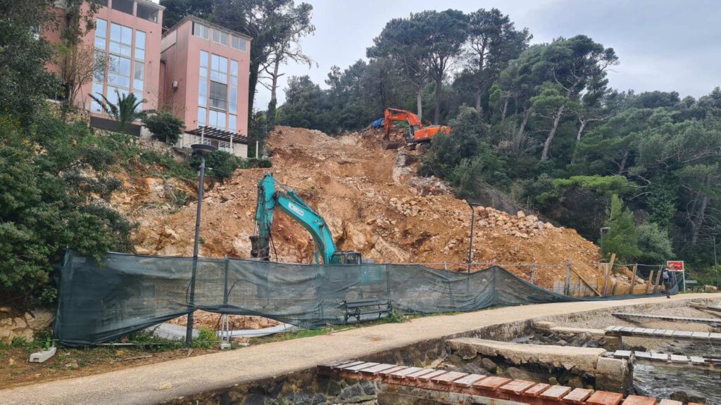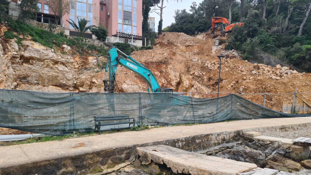 Gradilište buduće kuće u Bokeljskoj ulici došlo je gotovo do mora, odnosno, kamenja već padaju na šetnicu uz obalu. Brojni šetači i vlasnici barki koje su vezane uz kraj pitaju se je li opasno biti u blizini dok na strmoj parceli rade bageri?