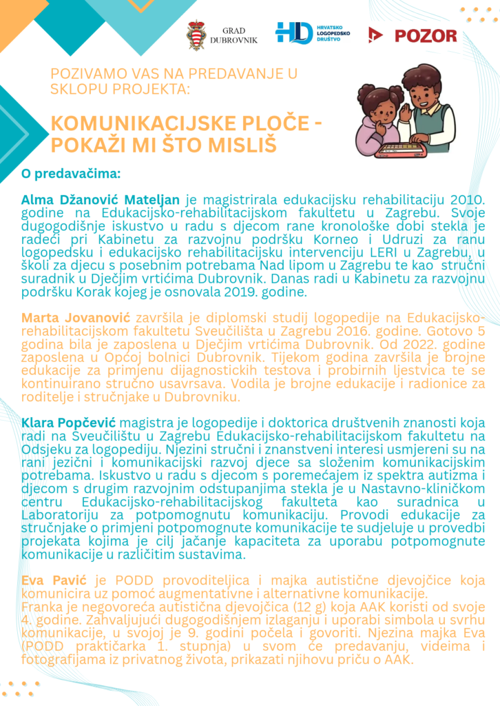 Hrvatsko logopedsko društvo – Podružnica Dubrovačko-neretvanske županije nositelj je projekta te vas poziva na sudjelovanje na predavanjima kojima je cilj doprinijeti senzibiliziranju i osvještavanju javnosti o potpomognutoj komunikaciji te informirati o načinu korištenja i svrsi potpomognute komunikacije. Predavanja će održati stručnjaci različitih profila i roditelj djeteta koje koristi potpomognutu komunikaciju.