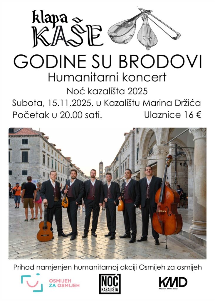Humanitarni koncert klape Kaše “Godine su brodovi” održat će se u subotu, 15. prosinca, u Kazalištu Marina Držića, s početkom u 20 sati. Ovim koncertom klapa otvara ovogodišnju humanitarnu akciju “Osmijeh za osmijeh”, koja je posvećena teško bolesnoj djevojčici Gabrieli Šetka.