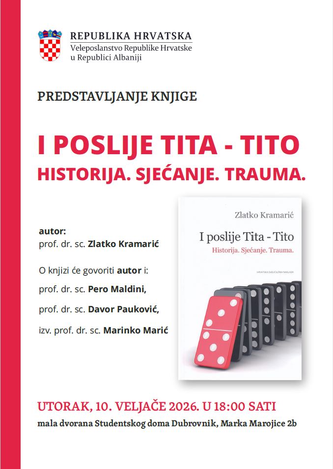 Predstavljanje knjige „I poslije Tita – Tito: Historija. Sjećanje. Trauma.“ autora prof. dr. sc. Zlatka Kramarića, će se održati u danas, 10. veljače 2026. godine, s početkom u 18 sati, u maloj dvorani Studentskog doma u Dubrovniku.