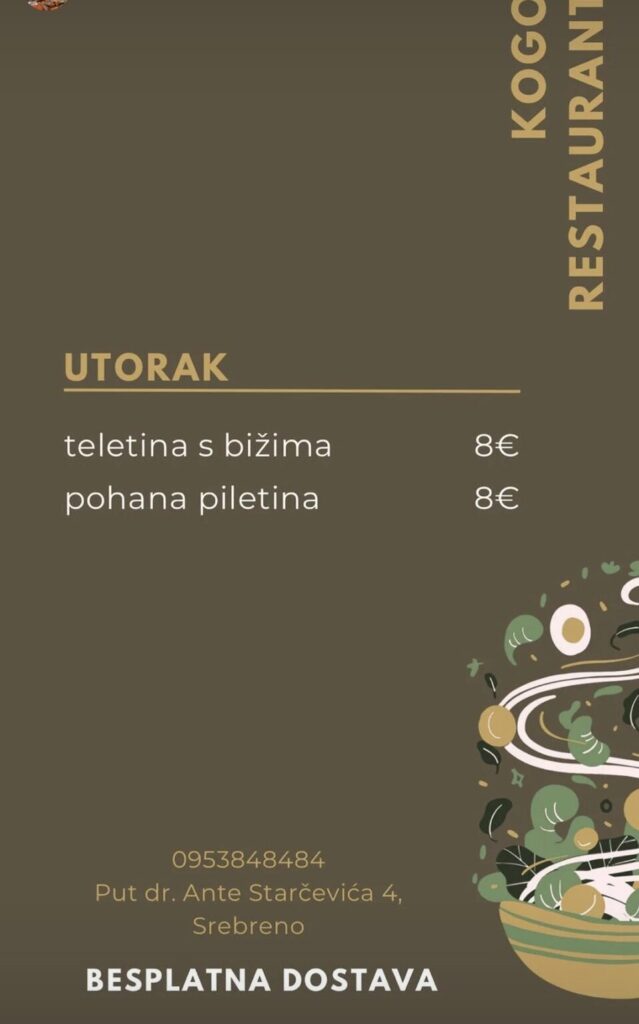Restoran KOGO, Srebreno, Župa dubrovačka – 095 384 8484, 095 596 8873, moguća dostava