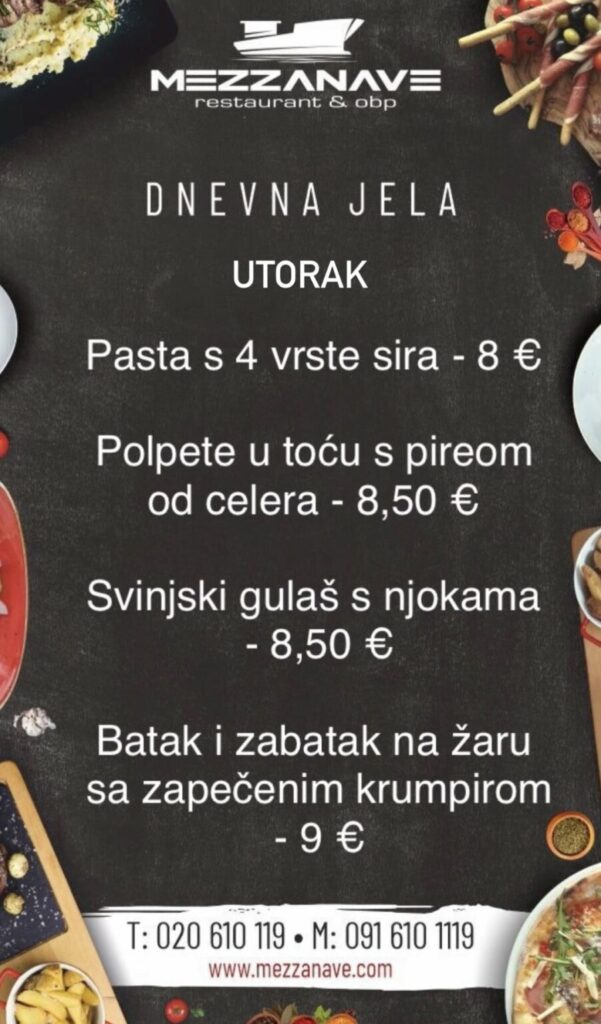Restoran Mezzanave, Dr. Ante Starčevića 24, telefoni: 020 610 119, 091 610 1119, moguća dostava