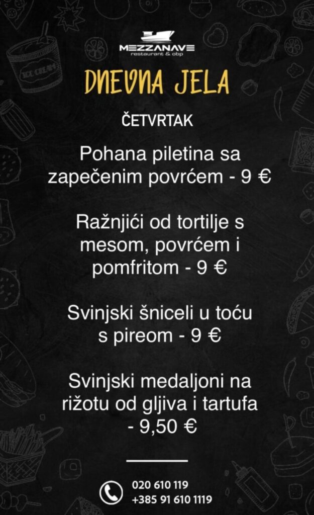 Restoran Mezzanave, Dr. Ante Starčevića 24, telefoni: 020 610 119, 091 610 1119, moguća dostava