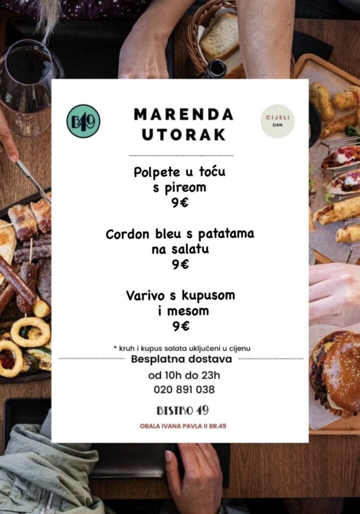 Bistro 49, Obala Ivana Pavla II, br.49, kontakt 020 891 038, moguća dostava