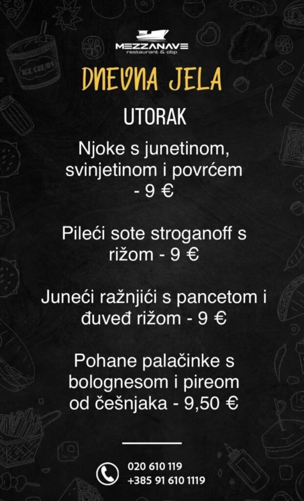 Restoran Mezzanave, Dr. Ante Starčevića 24, telefoni: 020 610 119, 091 610 1119, moguća dostava