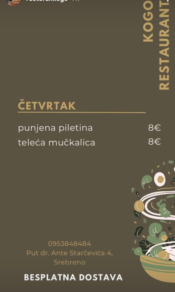 Restoran KOGO, Srebreno, Župa dubrovačka – 095 384 8484, 095 596 8873, moguća dostava