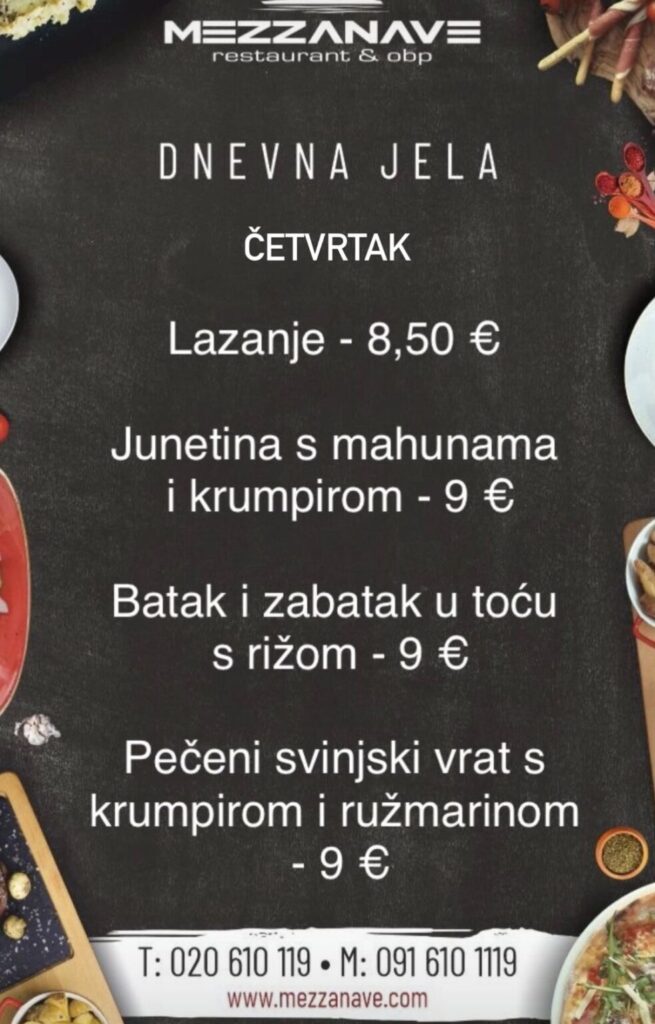 Restoran Mezzanave, Dr. Ante Starčevića 24, telefoni: 020 610 119, 091 610 1119, moguća dostava