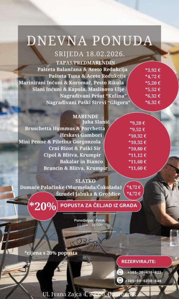 Imate ponudu dnevnih marendi, i želite ih promovirati na dubrovniknetu?! Javite se s povjerenjem na marketing@dubrovniknet.hr ili na 091 344 6000