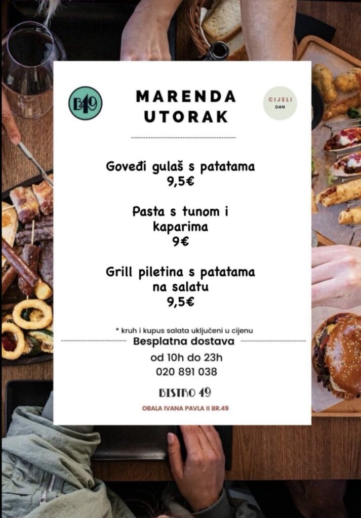 Bistro 49, Obala Ivana Pavla II, br.49, kontakt 020 891 038, moguća dostava