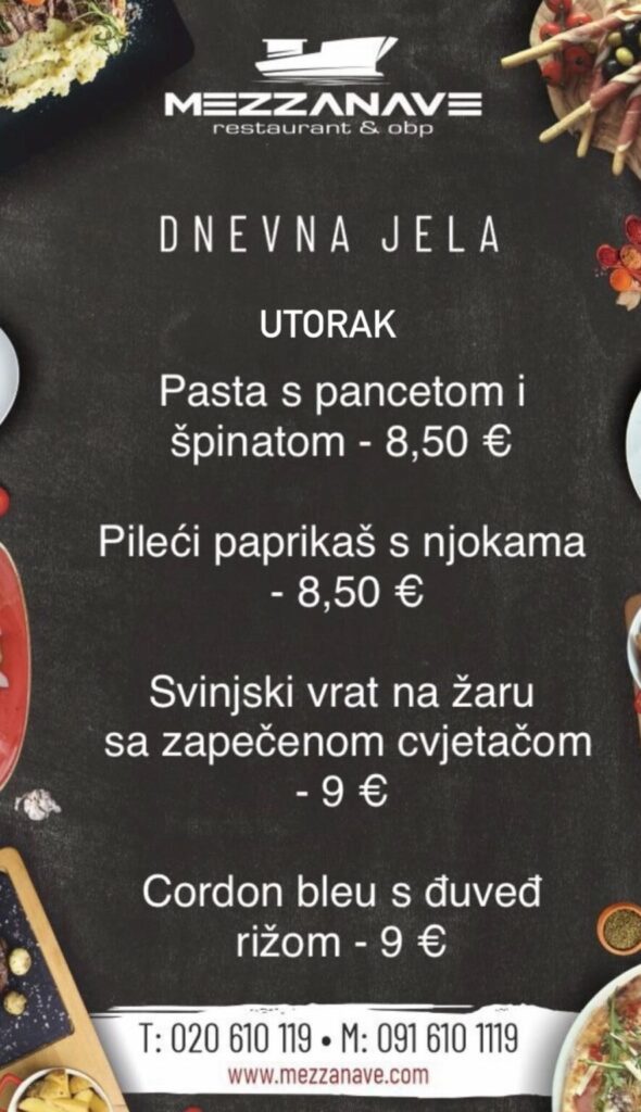 Restoran Mezzanave, Dr. Ante Starčevića 24, telefoni: 020 610 119, 091 610 1119, moguća dostava