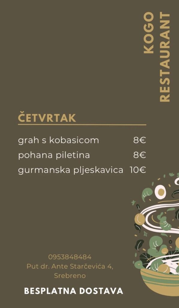 Restoran KOGO, Srebreno, Župa dubrovačka – 095 384 8484, 095 596 8873, moguća dostava
