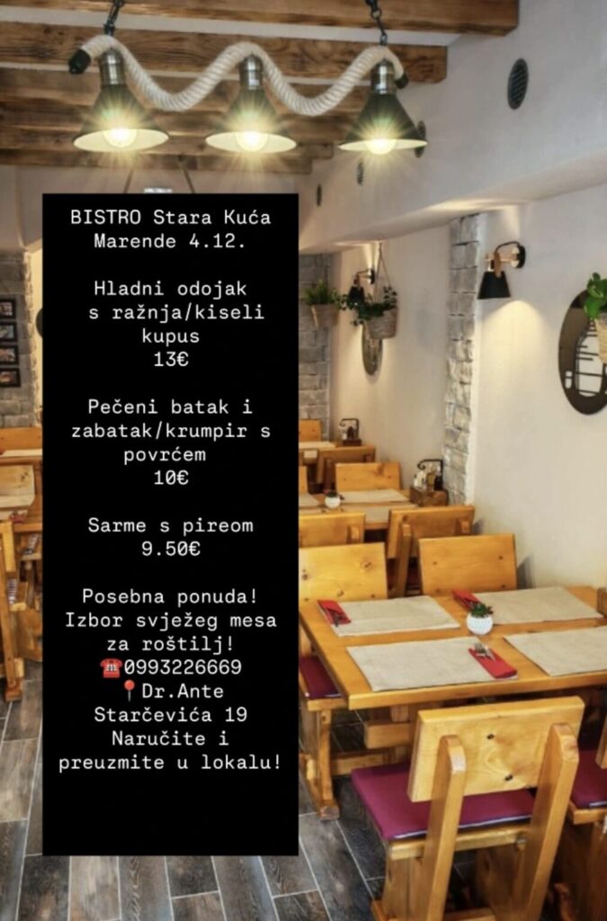 Bistro Strara Kuća, Dr.Ante Starčevića 19, kontakt 099 222 6669, ne vrše dostavu, moguće preuzimanje u restoranu