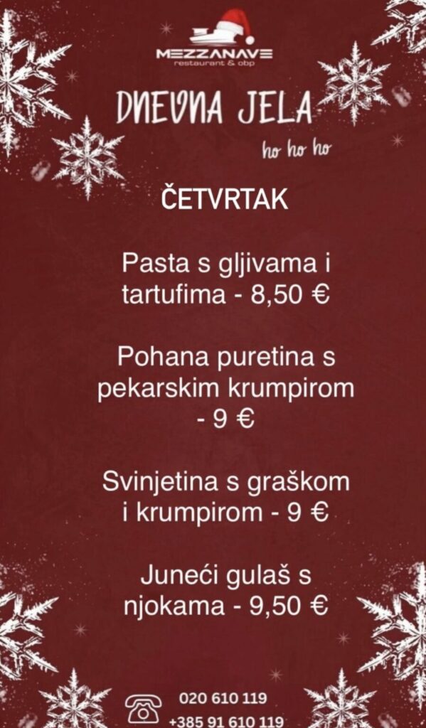 Restoran Mezzanave, Dr. Ante Starčevića 24, telefoni: 020 610 119, 091 610 1119, moguća dostava