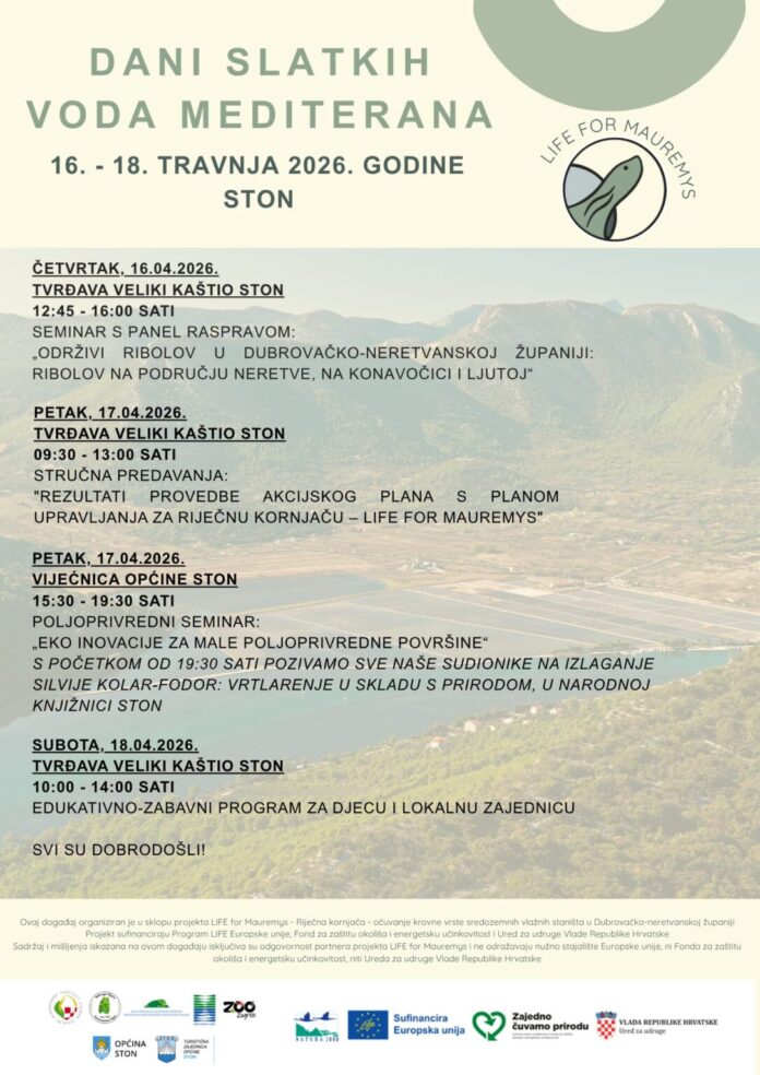 Javna ustanova za upravljanje zaštićenim dijelovima prirode Dubrovačko-neretvanske županije, kao partner projekta Riječna kornjača – očuvanje krovne vrste sredozemnih vlažnih staništa u Dubrovačko-neretvanskoj županiji – Life for Mauremys, organizira manifestaciju Dani slatkih voda Mediterana, koja će se održati od 16. do 18. travnja 2026. godine u Stonu.