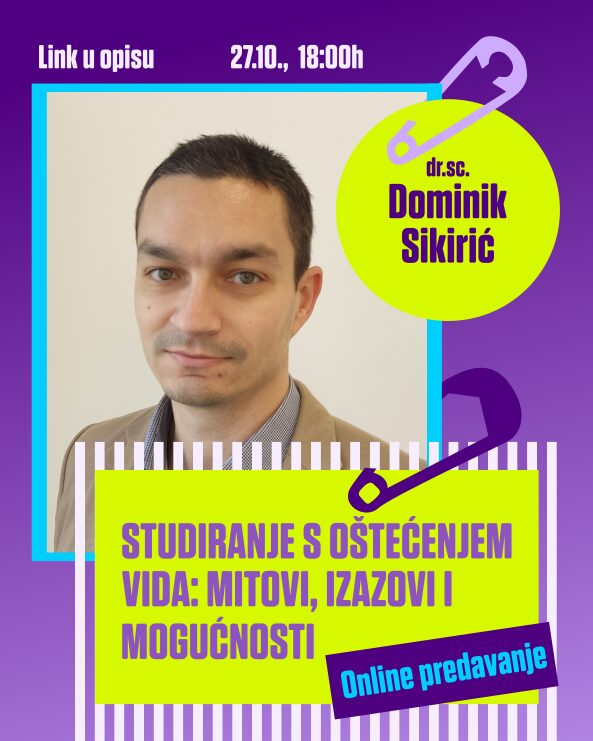 Sljedeće predavanje održat će se u ponedjeljak, 27. listopada u 18 sati, a bit će posvećeno studentima s oštećenjem vida. Razgovarat će se o mitovima o sljepoći i slabovidnosti te pojasniti vrste i stupnjeve oštećenja vida. Bit će riječi o glavnim izazovima studiranja, od nastave i ispita do digitalnih platformi i komunikacije, uz konkretne prijedloge rješenja i naglasak na pristupačnosti, ulozi nastavnika i strategijama samozastupanja studenata. Održat će ga dr. sc. Dominik Sikirić, edukacijski rehabilitator i viši predavač na Edukacijsko-rehabilitacijskom fakultetu Sveučilišta u Zagrebu, specijaliziran za područje orijentacije i kretanja osoba s oštećenjem vida.
