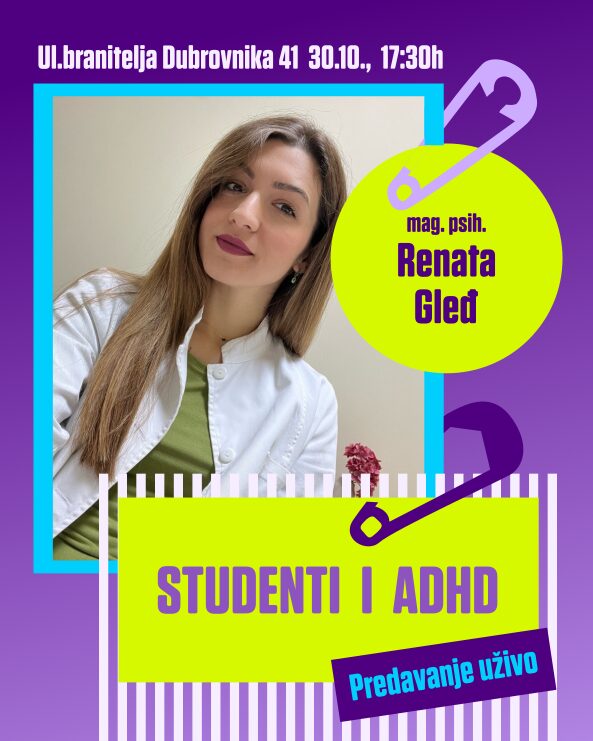 U četvrtak, 30. listopada u 17:30 sati, slijedi predavanje o poremećaju hiperaktivnosti i deficita pažnje (ADHD). Pojasnit će se što je ADHD i kako se manifestira kod mladih ljudi, s posebnim naglaskom na akademske izazove studenata s ADHD-om, strategije koje mogu pomoći u organizaciji i učenju te načine na koje se osobine ADHD-a mogu pretvoriti u prednost i izvor snage. Predavačica je mag. psych. Renata Gleđ, psihologinja zaposlena na Odjelu za psihijatriju Opće bolnice Dubrovnik, gdje djeluje u okviru Kabineta za kliničku psihologiju.