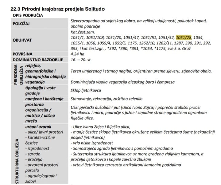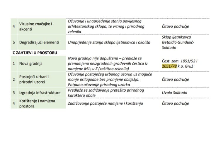 “Dubrovačka gradska uprava je prije pet godina, u prijedlogu izmjena i dopuna UPU “Gruški akvatorij”, č.zem. 1051/52 k.o. Gruž (sada 303/2 k.o. Dubrovnik Nova) i č.zem. 1051/78 k.o. Gruž (sada k.č. 247/2 k.o. Dubrovnik Nova), uvrstila među nekretnine obalnog područja za koje nije dopuštena nova gradnja.