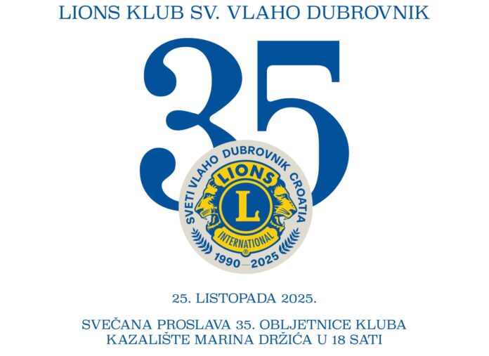 Lions klub Sveti Vlaho Dubrovnik ove će subote, 25. listopada 2025. svečanošću u Kazalištu Marina Dražića obilježiti 35 godina svog djelovanja, s početkom u 18 sati.